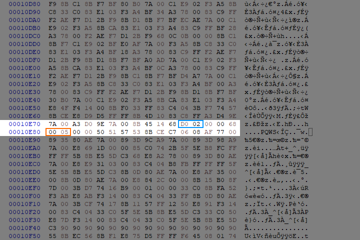 - In little-endian order, replace the bytes at the specified addresses with your new bytes (0xD0, 0x02 and 0x00, 0x05).