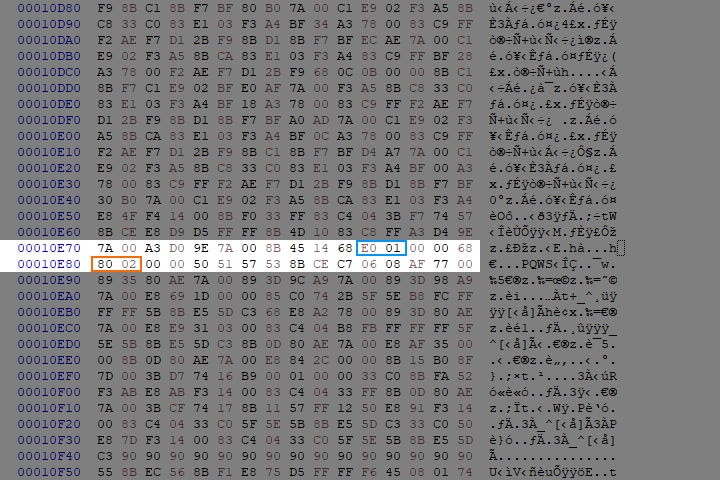 The only difference between the pre-patched “resolution exes” is four bytes within the exe, and these bytes can be manually updated to change the game’s render resolution. Copy any of the existing “resolution exes”, then open the copy using a hex editor.